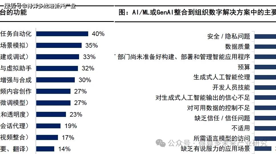 AI驱动的工做流从动化(如从动测试代码、模仿反复性使命)是首要需求。企业想要快速落地专属 GenAI使用(如客服、营销),AI处理方案落地的次要障碍:平安取现私问题是影响企业AI项目落地最大的障碍(19%)。